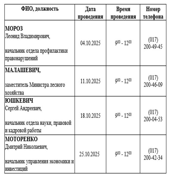 Четверг, 02 октября 2025 21:06Публикуем график "Прямых телефонных линий", проводимых в октябре 2025 года руководством Министерства лесного хозяйства и начальниками структурных подразделений во исполнение подпункта 1.2 пункта 1 Указа Президента Республики Беларусь от 13.06.2023 № 172.
